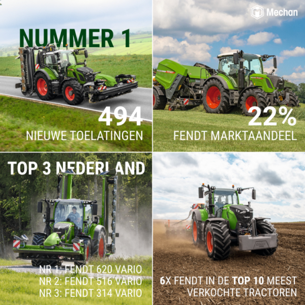 2025 was een bijzonder succesvol jaar voor Fendt. Met een marktaandeel van 22% is Fendt officieel de onbetwiste nummer één van Nederland. In totaal werden 494 nieuwe Fendt-tractoren toegelaten, waarmee het merk zich overtuigend positioneert als marktleider.